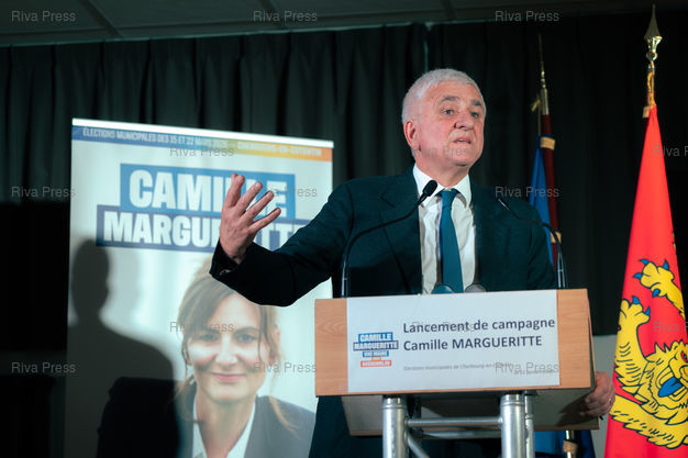 Légende : L'ancien ministre des armees et President de la région Normandie Herve Morin (Les Centristes) a la soiree de lancement de campagne de Camille Margueritte (LR), candidate aux elections municipales les 15 et 22 mars 2026 de Cherbourg-en-Cotentin (Manche). Cherbourg, 23 janvier 2026. Teo Manisier / Riva Press /// Former Minister of Defense and President of the Normandy region Hervé Morin (Les Centristes) at the campaign launch party for Camille Margueritte (LR), candidate in the March 15 and 22, 2026 municipal elections in Cherbourg-en-Cotentin (Manche). Cherbourg, January 23, 2026. Teo Manisier / Riva Press