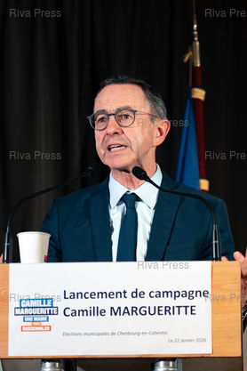 Légende : L'ancien ministre de l'Interieur, senateur (LR) et president des Republicains Bruno Retailleau au lancement de la campagne de Camille Margueritte, candidate d'opposition (LR) a la mairie de Cherbourg-en-Cotentin (Manche) contre le maire socialiste sortant Benoit Arrive, le 23 janvier 2026 a la salle Montecot a Cherbourg, pour les elections municipales des 15 et 22 mars 2026. Cherbourg-en-Cotentin, 23 janvier 2026. Teo Manisier / Riva Press /// Former Minister of the Interior, Senator (LR) and President of Les Républicains Bruno Retailleau at the launch of Camille Margueritte's campaign, opposition candidate (Republicans) for mayor of Cherbourg-en-Cotentin (Manche) against outgoing socialist mayor Benoit Arrive, on January 23, 2026, at the Salle Montecot in Cherbourg, for the municipal elections on March 15 and 22, 2026. Cherbourg-en-Cotentin, January 23, 2026. Teo Manisier / Riva Press