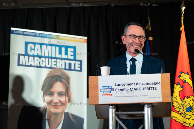 Légende : L'ancien ministre de l'Interieur, senateur (LR) et president des Republicains Bruno Retailleau au lancement de la campagne de Camille Margueritte, candidate d'opposition (LR) a la mairie de Cherbourg-en-Cotentin (Manche) contre le maire socialiste sortant Benoit Arrive, le 23 janvier 2026 a la salle Montecot a Cherbourg, pour les elections municipales des 15 et 22 mars 2026. Cherbourg-en-Cotentin, 23 janvier 2026. Teo Manisier / Riva Press /// Former Minister of the Interior, Senator (LR) and President of Les Républicains Bruno Retailleau at the launch of Camille Margueritte's campaign, opposition candidate (Republicans) for mayor of Cherbourg-en-Cotentin (Manche) against outgoing socialist mayor Benoit Arrive, on January 23, 2026, at the Salle Montecot in Cherbourg, for the municipal elections on March 15 and 22, 2026. Cherbourg-en-Cotentin, January 23, 2026. Teo Manisier / Riva Press