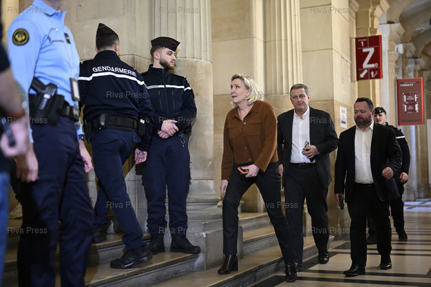 Légende : Procès en appel de Marine Le Pen et onze personnes dans l'affaire des assistants parlementaires du FN. Marine Le Pen avant les réquisitions prononcées par les avocats généraux, avec Louis Aliot et Bruno Bilde /// Appeal trial of Marine Le Pen and eleven people in the case of the parliamentary assistants of the Front National party. Marine Le Pen before the requisitions pronounced by the public prosecutors, with Louis Aliot and Bruno Bilde - Paris - 03/02/2026 - Photo © Lionel Préau +33 (0)6 68 12 83 77