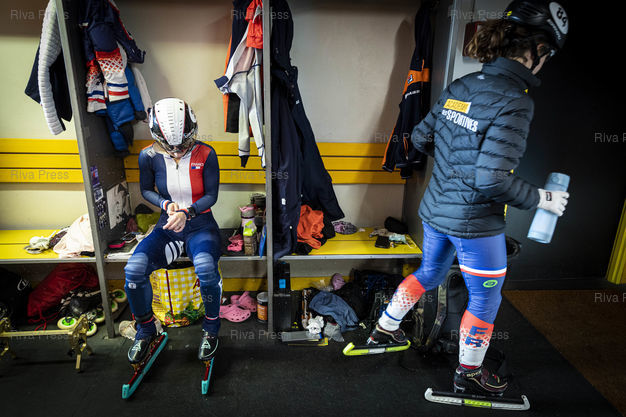 Légende : Font-Romeu, le 14 decembre 2021 - Tifany HUOT-MARCHAND (G) et Gwendoline DAUDET (D) se preparent dans le vestiaire avant l'entrainement. Entrainement de l'Equipe de France de short-track a la patinoire du Creps CNEA (Centre national d'entrainement en altitude) de Font Romeu (Pyrenees Orientales). PHOTO: Vincent NGUYEN / Riva Press