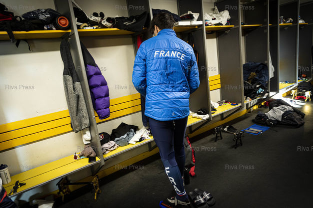 Légende : Font-Romeu, le 14 decembre 2021 - Entrainement de l'Equipe de France de short-track a la patinoire du Creps CNEA (Centre national d'entrainement en altitude) de Font Romeu (Pyrenees Orientales). PHOTO: Vincent NGUYEN / Riva Press