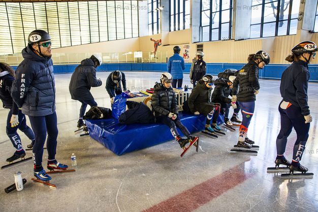 Légende : Font-Romeu, le 14 decembre 2021 - Quentin FERCOQ (G), Tifany HUOT-MARCHAND (C), Gwendoline DAUDET (casque 84) et Aurelie LEVEQUE (D). Entrainement de l'Equipe de France de short-track a la patinoire du Creps CNEA (Centre national d'entrainement en altitude) de Font Romeu (Pyrenees Orientales). PHOTO: Vincent NGUYEN / Riva Press