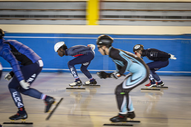 Légende : Font-Romeu, le 14 decembre 2021 - Entrainement de l'Equipe de France de short-track a la patinoire du Creps CNEA (Centre national d'entrainement en altitude) de Font Romeu (Pyrenees Orientales). PHOTO: Vincent NGUYEN / Riva Press