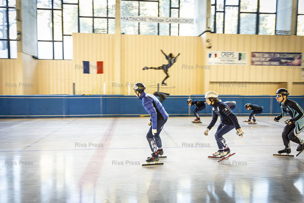 Légende : Font-Romeu, le 14 decembre 2021 - Entrainement de l'Equipe de France de short-track a la patinoire du Creps CNEA (Centre national d'entrainement en altitude) de Font Romeu (Pyrenees Orientales). PHOTO: Vincent NGUYEN / Riva Press