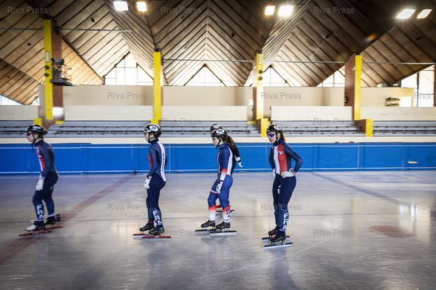 Légende : Font-Romeu, le 14 decembre 2021 - Tifany HUOT-MARCHAND (2eG), Gwendoline DAUDET (casque 84) et Aurelie LEVEQUE (D). Entrainement de l'Equipe de France de short-track a la patinoire du Creps CNEA (Centre national d'entrainement en altitude) de Font Romeu (Pyrenees Orientales). PHOTO: Vincent NGUYEN / Riva Press