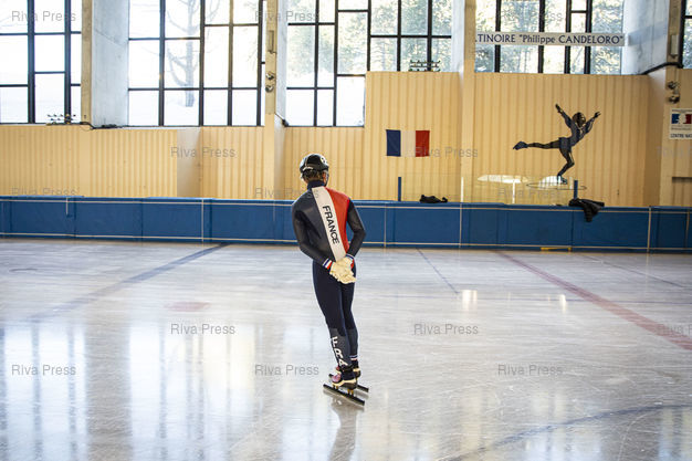 Légende : Font-Romeu, le 14 decembre 2021 - Entrainement de l'Equipe de France de short-track a la patinoire du Creps CNEA (Centre national d'entrainement en altitude) de Font Romeu (Pyrenees Orientales). PHOTO: Vincent NGUYEN / Riva Press