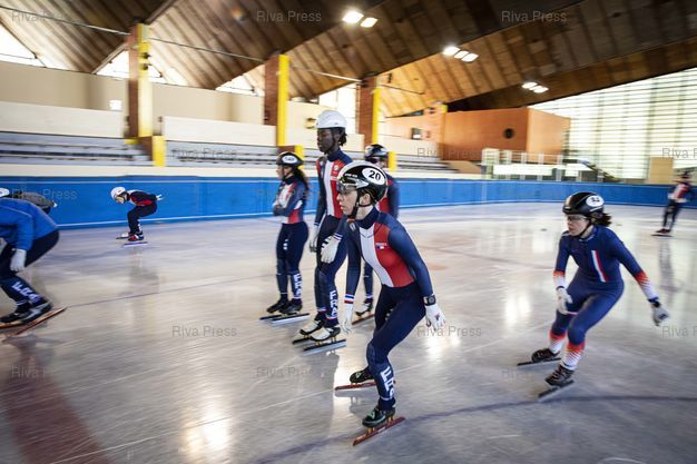 Légende : Font-Romeu, le 14 decembre 2021 - Sebastien LEPAPE (G),Tifany HUOT-MARCHAND (C) et Gwendoline DAUDET (D). Entrainement de l'Equipe de France de short-track a la patinoire du Creps CNEA (Centre national d'entrainement en altitude) de Font Romeu (Pyrenees Orientales). PHOTO: Vincent NGUYEN / Riva Press