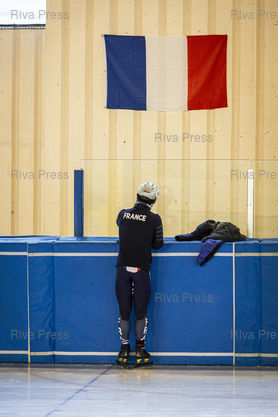 Légende : Font-Romeu, le 14 decembre 2021 - Entrainement de l'Equipe de France de short-track a la patinoire du Creps CNEA (Centre national d'entrainement en altitude) de Font Romeu (Pyrenees Orientales). PHOTO: Vincent NGUYEN / Riva Press