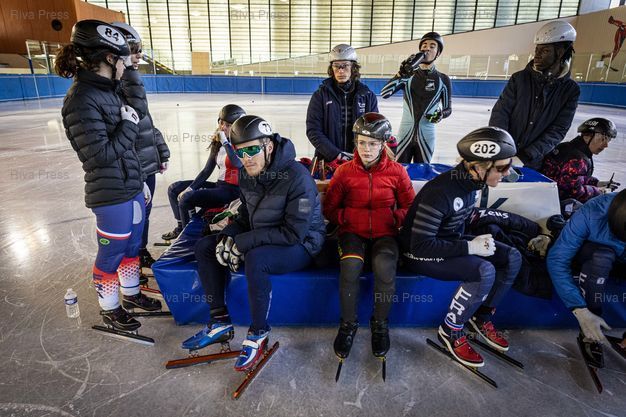 Légende : Font-Romeu, le 14 decembre 2021 - Gwendoline DAUDET (G), Tifany HUOT-MARCHAND (2eG) et Quentin FERCOQ (4eG). Entrainement de l'Equipe de France de short-track a la patinoire du Creps CNEA (Centre national d'entrainement en altitude) de Font Romeu (Pyrenees Orientales). PHOTO: Vincent NGUYEN / Riva Press