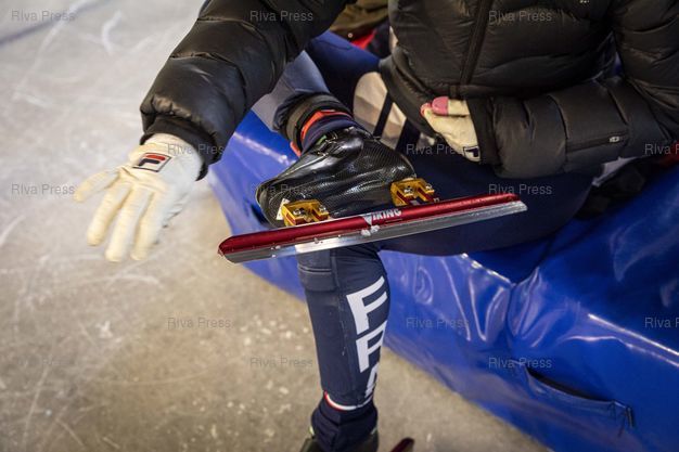 Légende : Font-Romeu, le 14 decembre 2021 - Entrainement de l'Equipe de France de short-track a la patinoire du Creps CNEA (Centre national d'entrainement en altitude) de Font Romeu (Pyrenees Orientales). PHOTO: Vincent NGUYEN / Riva Press
