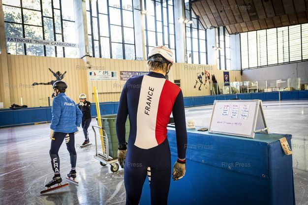 Légende : Font-Romeu, le 14 decembre 2021 - Sebastien LEPAPE (C). Entrainement de l'Equipe de France de short-track a la patinoire du Creps CNEA (Centre national d'entrainement en altitude) de Font Romeu (Pyrenees Orientales). PHOTO: Vincent NGUYEN / Riva Press