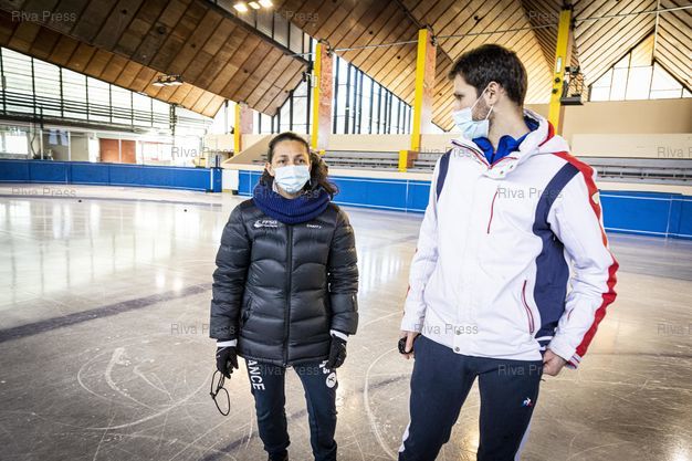 Légende : Font-Romeu, le 14 decembre 2021 - Annie SARRAT et Thibaut Meline, les deux entraineurs nationaux de l'equipe de France de short-track. Entrainement de l'Equipe de France de short-track a la patinoire du Creps CNEA (Centre national d'entrainement en altitude) de Font Romeu (Pyrenees Orientales). PHOTO: Vincent NGUYEN / Riva Press