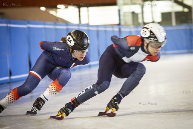 Légende : Font-Romeu, le 14 decembre 2021 - Gwendoline DAUDET (G) et Tifany HUOT-MARCHAND (D). Entrainement de l'Equipe de France de short-track a la patinoire du Creps CNEA (Centre national d'entrainement en altitude) de Font Romeu (Pyrenees Orientales). PHOTO: Vincent NGUYEN / Riva Press