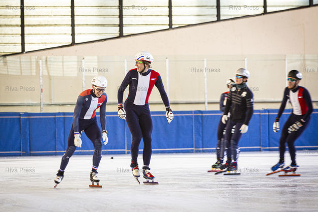 Légende : Font-Romeu, le 14 decembre 2021 - Tristan NAVARRO (G), Sebastien LEPAPE (2eG) et Quentin FERCOQ (D). Entrainement de l'Equipe de France de short-track a la patinoire du Creps CNEA (Centre national d'entrainement en altitude) de Font Romeu (Pyrenees Orientales). PHOTO: Vincent NGUYEN / Riva Press