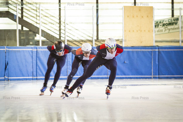 Légende : Font-Romeu, le 14 decembre 2021 - Sebastien LEPAPE (D), Tristan NAVARRO (C), et Quentin FERCOQ (G). Entrainement de l'Equipe de France de short-track a la patinoire du Creps CNEA (Centre national d'entrainement en altitude) de Font Romeu (Pyrenees Orientales). PHOTO: Vincent NGUYEN / Riva Press