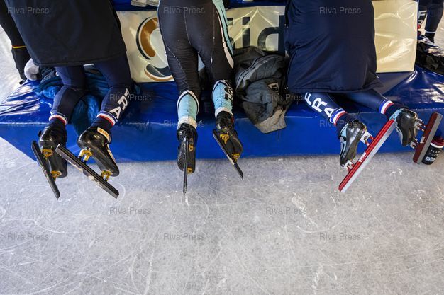 Légende : Font-Romeu, le 14 decembre 2021 - Entrainement de l'Equipe de France de short-track a la patinoire du Creps CNEA (Centre national d'entrainement en altitude) de Font Romeu (Pyrenees Orientales). PHOTO: Vincent NGUYEN / Riva Press