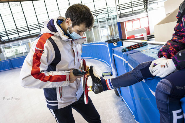 Légende : Font-Romeu, le 14 decembre 2021 - Thibaut Meline, un des deux entraineurs nationaux de l'equipe de France de short-track. Entrainement de l'Equipe de France de short-track a la patinoire du Creps CNEA (Centre national d'entrainement en altitude) de Font Romeu (Pyrenees Orientales). PHOTO: Vincent NGUYEN / Riva Press