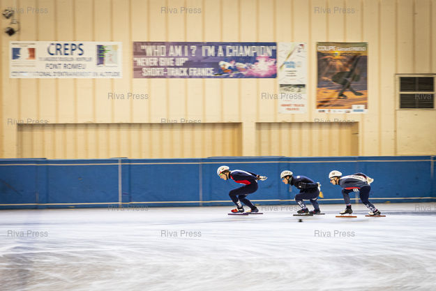 Légende : Font-Romeu, le 14 decembre 2021 - Sebastien LEPAPE (G). Entrainement de l'Equipe de France de short-track a la patinoire du Creps CNEA (Centre national d'entrainement en altitude) de Font Romeu (Pyrenees Orientales). PHOTO: Vincent NGUYEN / Riva Press