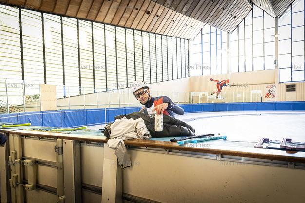 Légende : Font-Romeu, le 14 decembre 2021 - Tristan NAVARRO. Entrainement de l'Equipe de France de short-track a la patinoire du Creps CNEA (Centre national d'entrainement en altitude) de Font Romeu (Pyrenees Orientales). PHOTO: Vincent NGUYEN / Riva Press