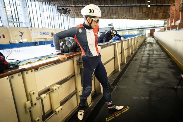 Légende : Font-Romeu, le 14 decembre 2021 - Tristan NAVARRO. Entrainement de l'Equipe de France de short-track a la patinoire du Creps CNEA (Centre national d'entrainement en altitude) de Font Romeu (Pyrenees Orientales). PHOTO: Vincent NGUYEN / Riva Press
