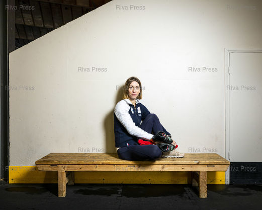 Légende : Font-Romeu, le 14 decembre 2021 - Portrait de Tifany HUOT-MARCHAND. Entrainement de l'Equipe de France de short-track a la patinoire du Creps CNEA (Centre national d'entrainement en altitude) de Font Romeu (Pyrenees Orientales). PHOTO: Vincent NGUYEN / Riva Press