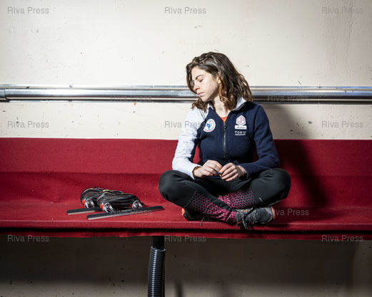 Légende : Font-Romeu, le 14 decembre 2021 - Portrait de Gwendoline DAUDET. Entrainement de l'Equipe de France de short-track a la patinoire du Creps CNEA (Centre national d'entrainement en altitude) de Font Romeu (Pyrenees Orientales). PHOTO: Vincent NGUYEN / Riva Press