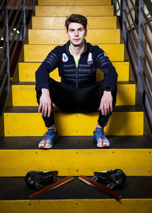 Légende : Font-Romeu, le 14 decembre 2021 - Portrait de Tristan NAVARRO. Entrainement de l'Equipe de France de short-track a la patinoire du Creps CNEA (Centre national d'entrainement en altitude) de Font Romeu (Pyrenees Orientales). PHOTO: Vincent NGUYEN / Riva Press