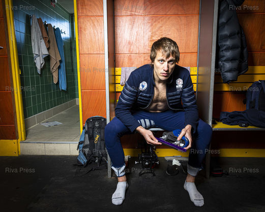 Légende : Font-Romeu, le 14 decembre 2021 - Portrait de Sebastien LEPAPE. Entrainement de l'Equipe de France de short-track a la patinoire du Creps CNEA (Centre national d'entrainement en altitude) de Font Romeu (Pyrenees Orientales). PHOTO: Vincent NGUYEN / Riva Press