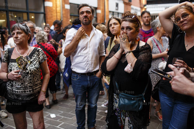 Légende : Toulouse, le 28 juin 2020 - Les partisans d'Antoine Maurice reunis au restaurant le J'Go, reagissent a l'annonce d'une premiere estimation annoncant leur candidat perdant a Toulouse le jour du second tour des elections muncipales a Toulouse. PHOTO: Vincent NGUYEN / Riva Press pour Le Monde