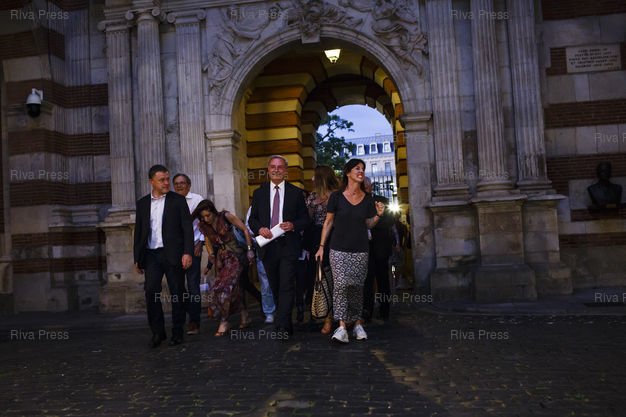 Légende : Toulouse, le 28 juin 2020 - Jean-Luc Moudenc, maire sortant LR arrive au Capitole apres l'annonce de sa victoire lors du second tour des elections muncipales a Toulouse. PHOTO: Vincent NGUYEN / Riva Press pour Le Monde