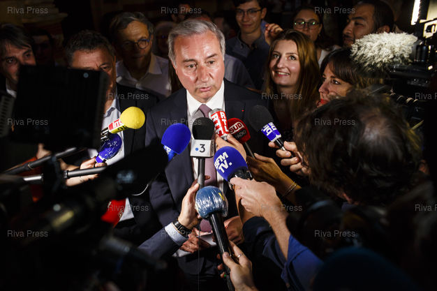 Légende : Toulouse, le 28 juin 2020 - Jean-Luc Moudenc, maire sortant LR s'adresse a la presse entoure de son epouse, de ses filles et de Laurence Arribage en arrivant au Capitole apres l'annonce de sa victoire lors du second tour des elections muncipales a Toulouse. PHOTO: Vincent NGUYEN / Riva Press pour Le Monde