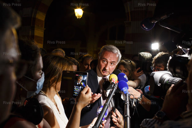 Légende : Toulouse, le 28 juin 2020 - Jean-Luc Moudenc, maire sortant LR s'adresse a la presse entoure de son epouse, de ses filles et de Laurence Arribage en arrivant au Capitole apres l'annonce de sa victoire lors du second tour des elections muncipales a Toulouse. PHOTO: Vincent NGUYEN / Riva Press pour Le Monde
