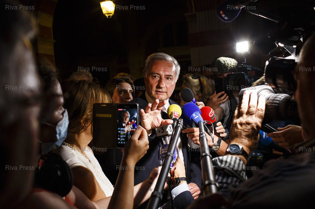 Légende : Toulouse, le 28 juin 2020 - Jean-Luc Moudenc, maire sortant LR s'adresse a la presse entoure de son epouse, de ses filles et de Laurence Arribage en arrivant au Capitole apres l'annonce de sa victoire lors du second tour des elections muncipales a Toulouse. PHOTO: Vincent NGUYEN / Riva Press pour Le Monde
