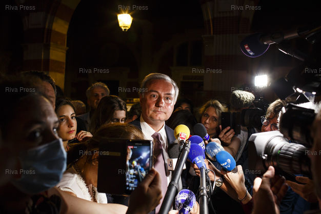 Légende : Toulouse, le 28 juin 2020 - Jean-Luc Moudenc, maire sortant LR s'adresse a la presse entoure de son epouse, de ses filles et de Laurence Arribage en arrivant au Capitole apres l'annonce de sa victoire lors du second tour des elections muncipales a Toulouse. PHOTO: Vincent NGUYEN / Riva Press pour Le Monde