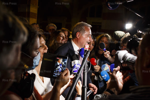 Légende : Toulouse, le 28 juin 2020 - Jean-Luc Moudenc, maire sortant LR s'adresse a la presse entoure de son epouse, de ses filles et de Laurence Arribage en arrivant au Capitole apres l'annonce de sa victoire lors du second tour des elections muncipales a Toulouse. PHOTO: Vincent NGUYEN / Riva Press pour Le Monde