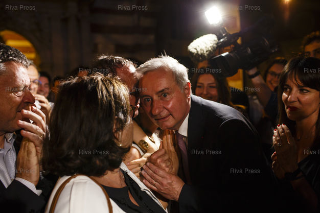 Légende : Toulouse, le 28 juin 2020 - Jean-Luc Moudenc, maire sortant LR s'adresse a la presse entoure de son epouse, de ses filles et de Laurence Arribage en arrivant au Capitole apres l'annonce de sa victoire lors du second tour des elections muncipales a Toulouse. PHOTO: Vincent NGUYEN / Riva Press pour Le Monde