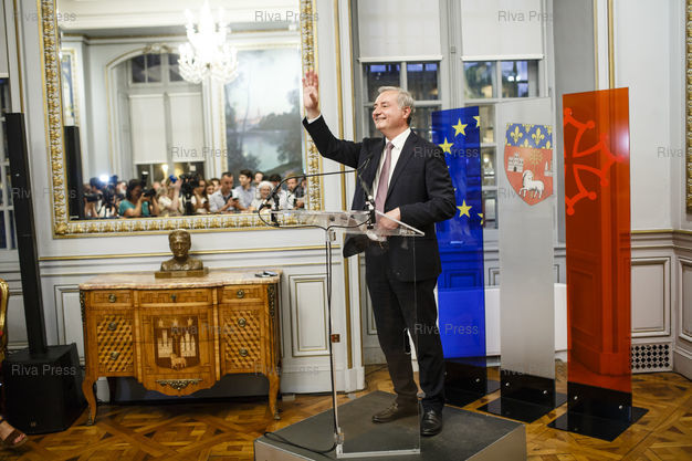 Légende : Toulouse, le 28 juin 2020 - Jean-Luc Moudenc, maire sortant LR fait une declaration au Capitole apres l'annonce de sa victoire lors du second tour des elections muncipales a Toulouse. PHOTO: Vincent NGUYEN / Riva Press pour Le Monde
