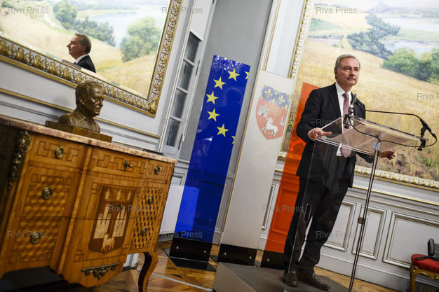 Légende : Toulouse, le 28 juin 2020 - Jean-Luc Moudenc, maire sortant LR fait une declaration au Capitole apres l'annonce de sa victoire lors du second tour des elections muncipales a Toulouse. PHOTO: Vincent NGUYEN / Riva Press pour Le Monde