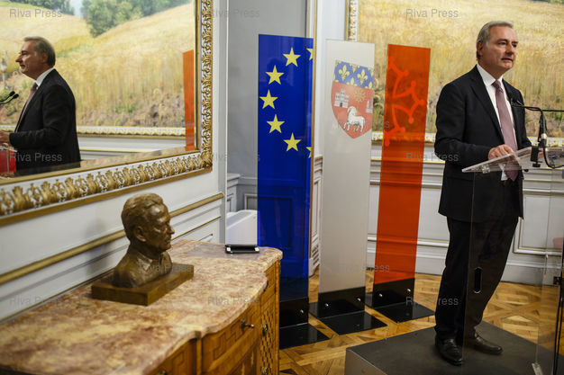 Légende : Toulouse, le 28 juin 2020 - Jean-Luc Moudenc, maire sortant LR fait une declaration au Capitole apres l'annonce de sa victoire lors du second tour des elections muncipales a Toulouse. PHOTO: Vincent NGUYEN / Riva Press pour Le Monde
