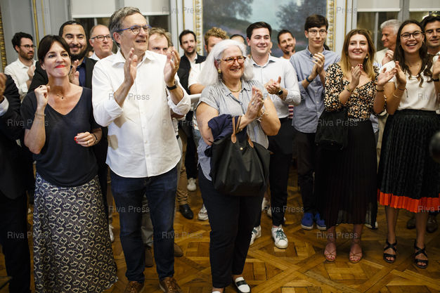 Légende : Toulouse, le 28 juin 2020 - Ses partisans applaudissent Jean-Luc Moudenc, maire sortant LR apres sa declaration au Capitole apres l'annonce de sa victoire lors du second tour des elections muncipales a Toulouse. PHOTO: Vincent NGUYEN / Riva Press pour Le Monde