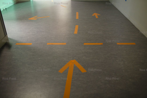 Légende : Toulouse, le 28 juin 2020 - Marquage au sol dans un bureau de vote a Toulouse le jour du second tour des elections muncipales a Toulouse. PHOTO: Vincent NGUYEN / Riva Press pour Le Monde