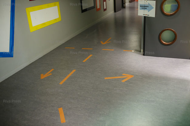 Légende : Toulouse, le 28 juin 2020 - Marquage au sol dans un bureau de vote a Toulouse le jour du second tour des elections muncipales a Toulouse. PHOTO: Vincent NGUYEN / Riva Press pour Le Monde