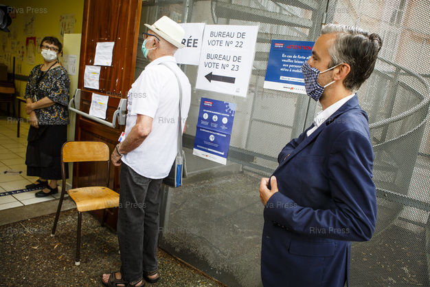 Légende : Toulouse, le 28 juin 2020 - Antoine Maurice, candidat ecologiste de la liste Archipel Citoyen (ecologistes, gauche) vote a Toulouse dans le quartier Bonnefoy le jour du second tour des elections muncipales a Toulouse. PHOTO: Vincent NGUYEN / Riva Press pour Le Monde