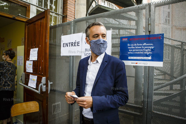 Légende : Toulouse, le 28 juin 2020 - Antoine Maurice, candidat ecologiste de la liste Archipel Citoyen (ecologistes, gauche) vote a Toulouse dans le quartier Bonnefoy le jour du second tour des elections muncipales a Toulouse. PHOTO: Vincent NGUYEN / Riva Press pour Le Monde