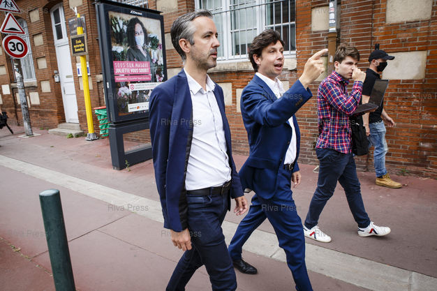 Légende : Toulouse, le 28 juin 2020 - Antoine Maurice (G), candidat ecologiste de la liste Archipel Citoyen (ecologistes, gauche) apres avoir vote a Toulouse dans le quartier Bonnefoy le jour du second tour des elections muncipales a Toulouse. Avec Romain Cujives (C), son directeur de campagne. PHOTO: Vincent NGUYEN / Riva Press pour Le Monde