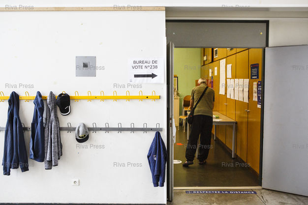 Légende : Toulouse, le 28 juin 2020 - Un electeur se lave les mains au gel hydroalcoolique a Toulouse avant d'aller voter le jour du second tour des elections muncipales a Toulouse. Avec Romain Cujives (C), son directeur de campagne. PHOTO: Vincent NGUYEN / Riva Press pour Le Monde