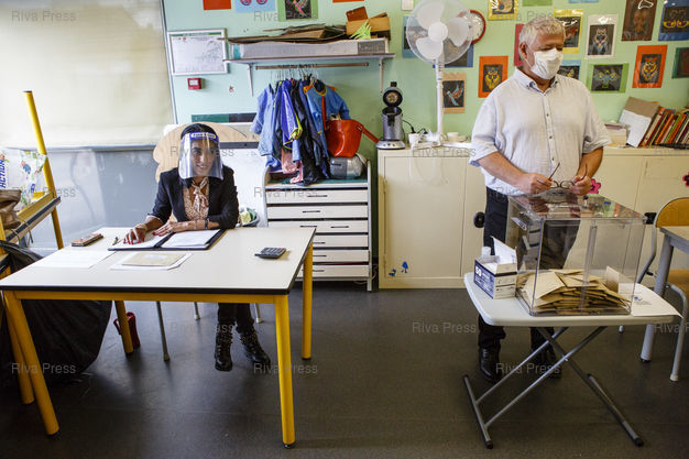 Légende : Toulouse, le 28 juin 2020 - Le president (D) et la secretaire (G) d'un bureau de vote a Toulouse le jour du second tour des elections muncipales a Toulouse. PHOTO: Vincent NGUYEN / Riva Press pour Le Monde
