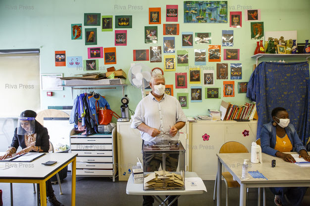Légende : Toulouse, le 28 juin 2020 - Le president (C), la secretaire (G) et une assesseure d'un bureau de vote a Toulouse le jour du second tour des elections muncipales a Toulouse. PHOTO: Vincent NGUYEN / Riva Press pour Le Monde