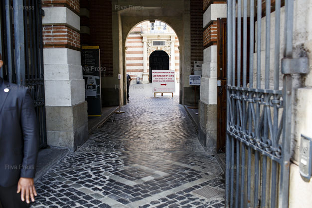 Légende : Toulouse, le 28 juin 2020 - Un vigile controle les sacs des electeurs a l'entree du bureau de vote du Capitole a Toulouse le jour du second tour des elections muncipales a Toulouse. PHOTO: Vincent NGUYEN / Riva Press pour Le Monde